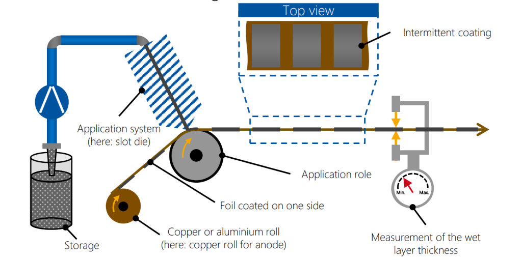 • Coating onto metal foils (copper for anodes, aluminum for cathodes)