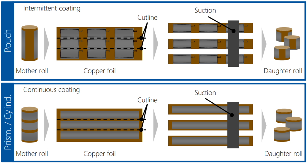 Electrodes are cut into precise shapes to fit cell designs (pouch, cylindrical, or prismatic). Accuracy is critical to prevent defects during assembly.